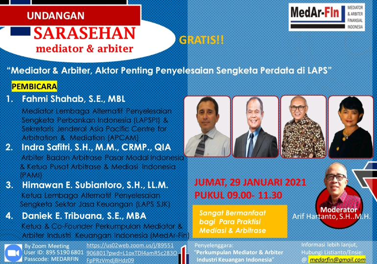 MedAr-FIn akan menyelenggarakan Sarasehan dengan judul “Mediator dan Arbiter: Aktor Penting dalam Penyelesaian Sengketa Perdata di LAPS, pada tanggal 29 Januari 2021.